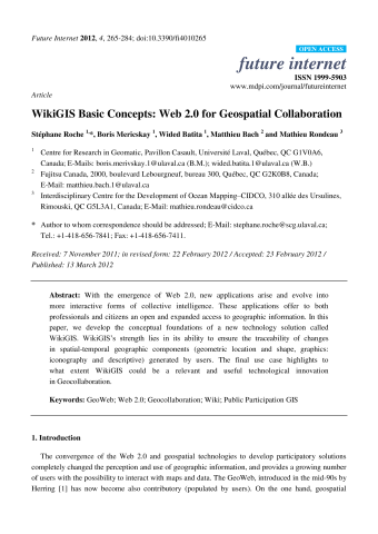 Stéphane Roche, Boris Mericskay, Wided Batita, Matthieu Bach, Mathieu Rondeau. WikiGIS Basic Concepts: Web 2.0 for Geospatial Collaboration. Future internet, MDPI, 2012, 4 (1), pp.265-284. ⟨10.3390/fi4010265⟩. ⟨halshs-02309571⟩