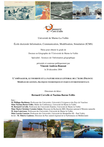 Vincent Andreu-Boussut. L'aménageur, le touriste et la nature sur le littoral de l'Aude. Modèles d'aménagement, pratiques touristiques et enjeux environnementaux.. Sciences de l'Homme et Société. Université de Marne la Vallée, 2004. Français. ⟨tel-00264255⟩