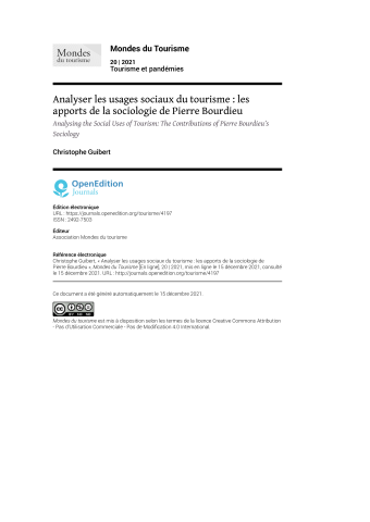 Christophe Guibert. Analyser les usages sociaux du tourisme : les apports de la sociologie de Pierre Bourdieu. Mondes du tourisme, Paris: Éd. touristiques européennes, 2021, ⟨10.4000/tourisme.4197⟩. ⟨hal-03675468⟩