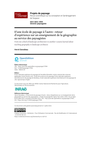 How can academics who are not landscape architects find their place and make their discipline useful in the training of landscape architects? This frequently asked question is posed differently according to the discipline and the school. This article focuses on the specific case of a geographer who was first recruited at the Versailles school of landscape architecture and subsequently at the school of landscape architecture in Angers. It provides an opportunity to grasp the structural effects of these institutional frameworks on a teaching method that seeks to adapt to them by being part of specific training courses and to defend the disciplinary fundamentals common to the courses. These two perspectives make it possible to better understand and untangle a number of “pedagogical conundrums” which are characteristic of the teaching of geography considered as a supporting discipline in the training of landscape architects and urban planners. The article partially reproduces the first (pedagogical) volume of a research publication (Davodeau, 2020), which explains its biographical and reflective dimension.