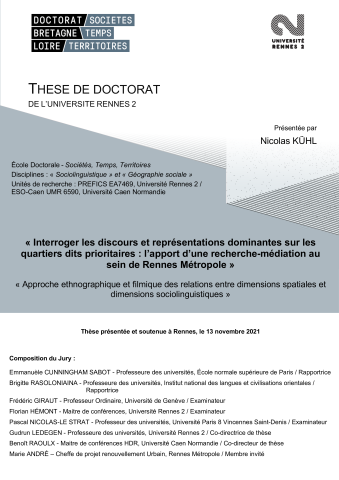 Nicolas Kühl. Interroger les discours et représentations dominantes sur les quartiers dits prioritaires : l’apport d’une recherche-médiation au sein de Rennes Métropole. Approche ethnographique et filmique des relations entre dimensions spatiales et dimensions sociolinguistiques.. Sciences de l'Homme et Société. Université Rennes 2, 2021. Français. ⟨NNT : ⟩. ⟨tel-03429706⟩