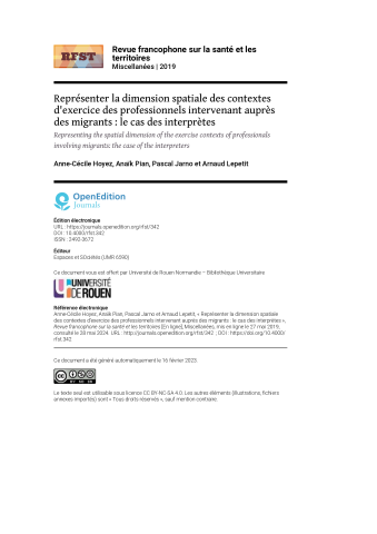 Anne-Cécile Hoyez, Anaik Pian, Pascal Jarno, Arnaud Lepetit. Représenter la dimension spatiale des contextes d'exercice des professionnels intervenant auprès de migrants : le cas des interprètes. Revue francophone sur la santé et les territoires, 2019, ⟨10.4000/rfst.342⟩. ⟨halshs-02296262⟩