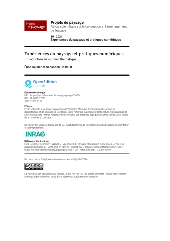 Élise Geisler, Sébastien Caillault. Expériences du paysage et pratiques numériques : Introduction au numéro thématique. Projets de paysage : revue scientifique sur la conception et l'aménagement de l'espace, 2024, 30, ⟨10.4000/120t0⟩. ⟨hal-04684980⟩