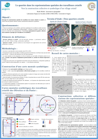 Ce poster présente une méthodologie originale pour la construction de cartes mentales synthétiques visant à mettre en lumière et à analyser les éléments collectivement partagés dans les représentations individuelles d'un groupe social. Cette proposition méthodologique s'appuie sur des enquêtes empiriques (168 entretiens et 100 cartes mentales) menées dans le cas des travailleurs créatifs regroupés au sein de quartiers urbains spécifiques.