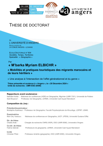This thesis explores the interactions between migration and tourism by analyzing the tourism practices of Moroccan migrants and their heirs. First, it examines the evolution of mobility and practices through the prism of the generational effect, considering economic, social, legal and cultural variables, both in the country of residence and in the country of origin. It then extends the analysis to link these mobilities and practices to the construction of a transnational space, grounded and anchored in a transnational identity. By adopting a transnational and intersectional perspective, this study considers tourist stays in the country of origin as mechanisms of complex interaction between migration, tourism, mobility, social norms, gender, generational effect, social class and geographical scales.