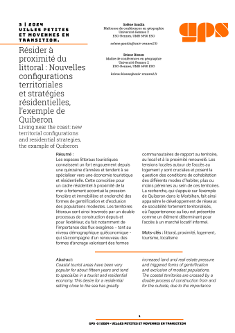 Les espaces littoraux touristiques connaissent un fort engouement depuis une quinzaine d’années et tendent à se spécialiser vers une économie touristique et résidentielle. Cette convoitise pour un cadre résidentiel à proximité de la mer a fortement accentué la pression foncière et immobilière et enclenché des formes de gentrification et d’exclusion des populations modestes. Les territoires littoraux sont ainsi traversés par un double processus de construction depuis et pour l’extérieur, du fait notamment de l’importance des flux exogènes – tant au niveau démographique qu’économique - qui s’accompagne d’un renouveau des formes d’ancrage valorisant des formes communautaires de rapport au territoire, au local et à la proximité renouvelé. Les tensions locales autour de l’accès au logement y sont cruciales et posent la question des conditions de cohabitation des différents modes d’habiter, plus ou moins pérennes au sein de ces territoires. La recherche, qui s’appuie sur l’exemple de Quiberon dans le Morbihan, fait ainsi apparaitre le développement de réseaux de sociabilité fortement territorialisés, où l’appartenance au lieu est présentée comme un élément déterminant pour l’accès à un marché locatif informel.