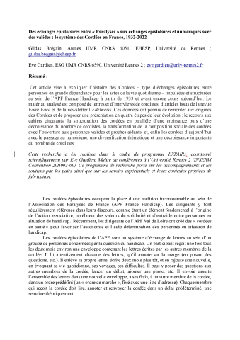 Gildas Brégain, Eve Gardien. Des échanges épistolaires entre “Paralysés” aux échanges épistolaires et numériques avec des valides : le système des Cordées en France, 1932-2022. Alter: European Journal of Disability Research / Revue européenne de recherche sur le handicap, 2025, 19-3, ⟨10.4000/14qxl⟩. ⟨halshs-05287338⟩